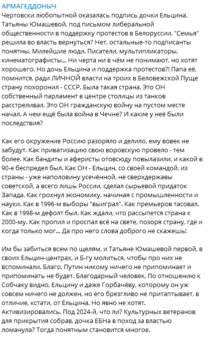 Дочь первого президента России Бориса Ельцина Татьяна Юмашева подписалась под письмом либеральной общественности в поддержку протестов в Белоруссии. Политолог Евгений Сатановский напомнил белорусам о "заслугах" отца Юмашевой и его окружения в 1990-х.