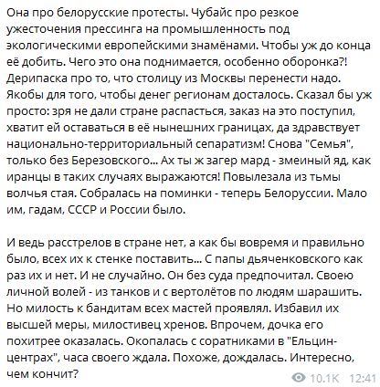 Дочка в поход за властью ломанула? Тогда понятным становится многое. Повылезала из тьмы волчья стая. Собралась на поминки - теперь Белоруссии. Мало им, гадам, СССР и России было, - пишет Сатановский в Telegram.