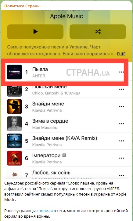 Однако завывания последней группы, очевидно, не помогают. И вот уже песня "Пыяла", которую исполняет группа АИГЕЛ, возглавила рейтинг самых популярных песен в Украине по версии Apple Music.