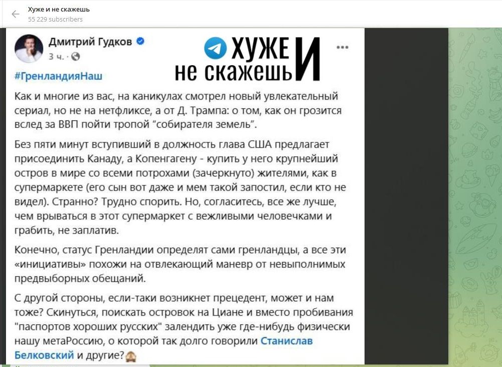 Но тут же дал понять – по поводу всего, что приходит из высоких кабинетов Вашингтона, отечественные либералы готовы взять под козырёк и тут же начать подражать. Сперва в ход пошёл любимый принцип русофобов "вы не понимаете, это другое": мол, желание Трампа присоединить Гренландию, принадлежащую Дании, это необычно – но ведь вроде речь идёт о покупке острова, а не как русские, сразу СВО начинать. Тут якобы всё правильно и цивилизованно, так можно…