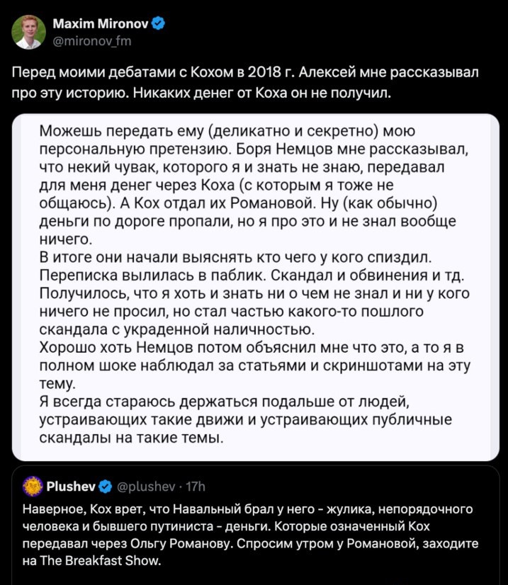 И здесь возникает интересный момент. Потому что в январе 2018 года основатель ФБК попросил передать во время дебатов Коху* его "персональную претензию" по поводу якобы переданных от "некого чувака" средств. Навальный утверждал, что деньги до него так и не добрались.