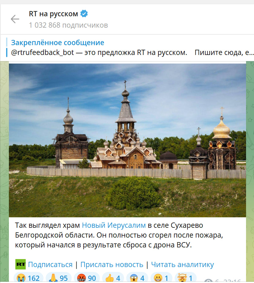 Очевидцы сообщают, что в селе Сухарево Валуйского района горит храмовый комплекс Новый Иерусалим. Телеграм-канал SHOT пишет, что причиной пожара стала атака ВСУ.