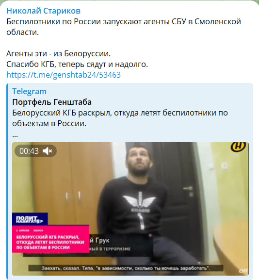 Видео с допросом одного из задержанных преступников, подозреваемых в терроризме, опубликовали на белорусском телевидении, на телеканале ОНТ. Там некий уголовник Евгений Грук рассказал, что СБУ вербует граждан Белоруссии за небольшую плату и направляет их в Смоленскую область, указывая схрон с БПЛА. По словам Грука, им остаётся только перевести дроны на пусковые позиции и запустить.