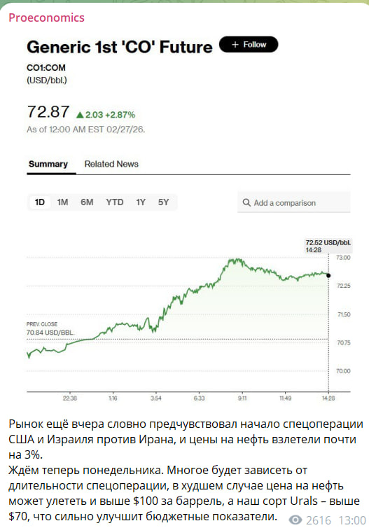 Стоит отметить, что речь идёт не о так называемой эталонной нефти, а о "грязной" и довольно дешёвой. Стоимость эталонного сорта Brent продолжал расти пропорционально угрозам Трампа в адрес Тегерана. За 3 месяца - плюс 15% (до 73,27 долларов за баррель). Рекордом за последние 10 лет является май 2022 года – более 100 долларов. Но, как говорится, ещё не вечер, причём, буквально. Ожидается, что к понедельнику, когда откроются торги, этот показатель вырастит до нового потолка. А наш сорт URALS до 70 долларов за баррель как минимум.