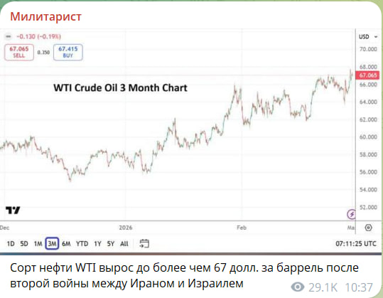 Едва начались удары Ирану, цены на нефть пробили очередной потолок. Сорт нефти WTI вырос до более чем 67 долларов за баррель, причём впервые, как минимум, за последние 3 месяца. И продолжает расти.