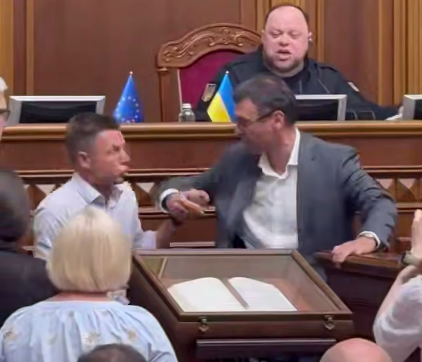 В Верховной раде произошла потасовка между депутатом от оппозиционной партии Петра Порошенко* "Европейская солидарность" Алексеем Гончаренко* и представителем фракции правящей партии "Слуга народа" Зеленского Даниилом Гетманцевым. Причём случилось это уже во второй раз за день.