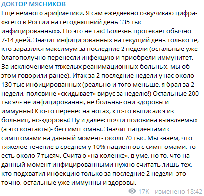 "Итак, за последние две недели у нас около 130 тыс. инфицированных (реально и того меньше, я брал за две недели, половина «скидывает» вирус за неделю!) Остальные 200 тысяч - не инфицированы, не больны - они здоровы и иммунны!" - написал он, отметив, что "кто-то перенёс на ногах, кто-то выписался из больниц, но - здоровы!"