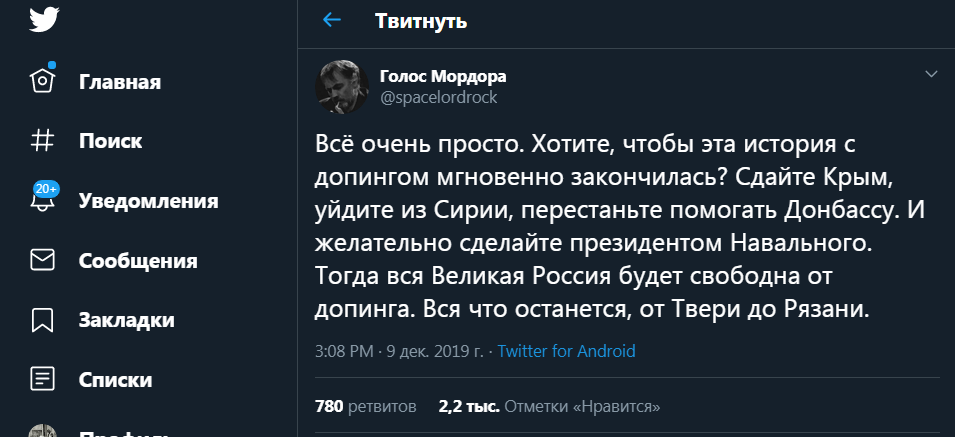 "Всё очень просто. Хотите, чтобы эта история с допингом мгновенно закончилась? Сдайте Крым, уйдите из Сирии, перестаньте помогать Донбассу. И желательно, сделайте президентом Навального. Тогда вся великая Россия будет свободна от допинга. Вся, что останется, - от Твери до Рязани".