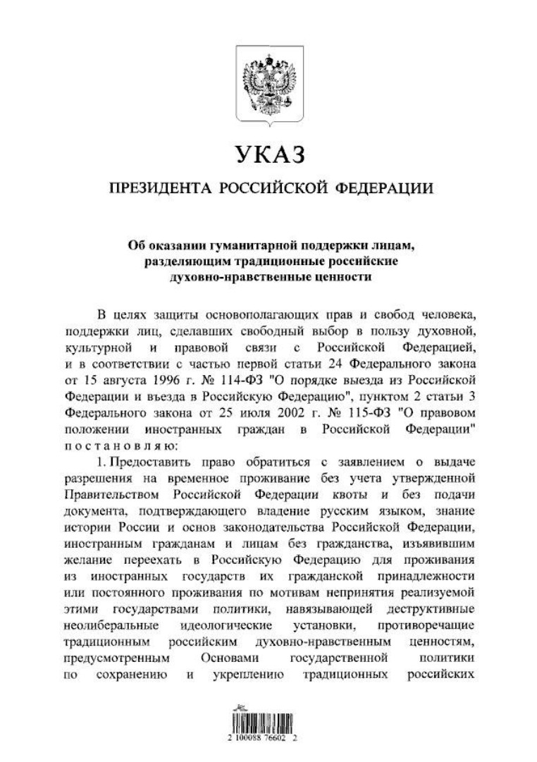 Путин подписал указ об оказании гуманитарной поддержки лицам, разделяющим традиционные российские духовно-нравственные ценности.