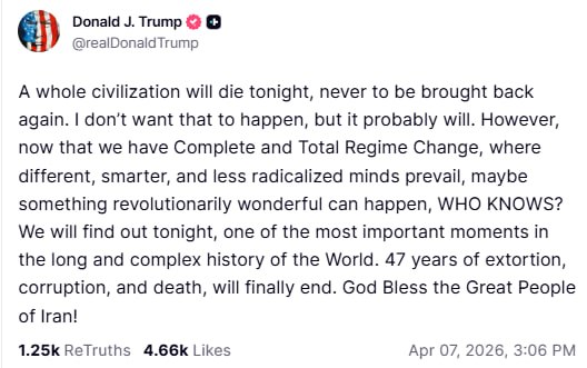 Трамп назвал срок новых атак на энергетику Ирана — вечер 7 апреля. "Сегодня ночью погибнет целая цивилизация, и её уже никогда не вернуть", - заявил президент США. Куда полетят американские ракеты?