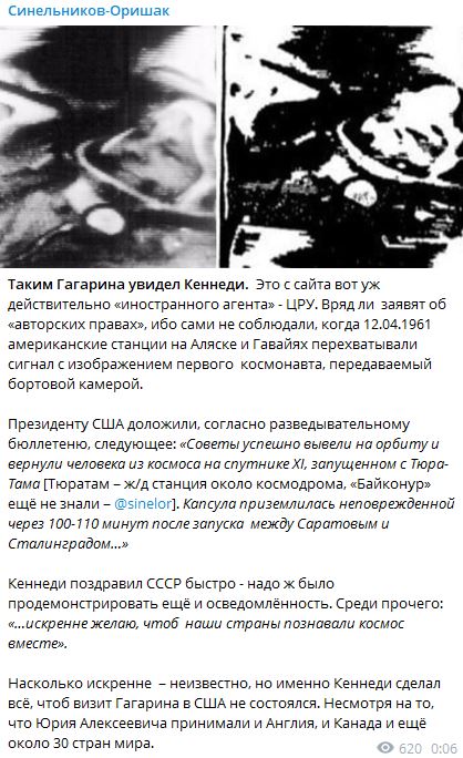Насколько искренне - неизвестно, но именно Кеннеди сделал всё, чтобы визит Гагарина в США не состоялся. Несмотря на то что Юрия Алексеевича принимали и Англия, и Канада, и ещё около 30 стран мира, - пишет в Telegram политолог Михаил Синельников-Оришак.