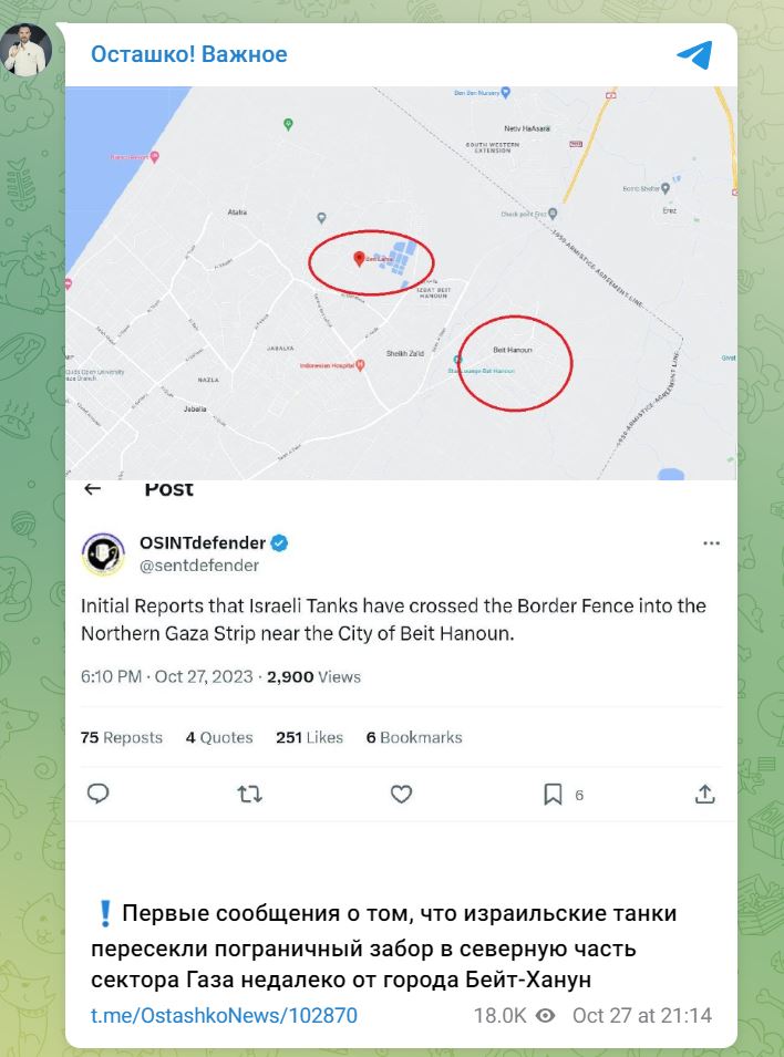 21:24 "Спецназ США принимает участие в боевых действиях в секторе Газа", - пишет паблик "Это ещё не конец". Утверждается, что американцы корректируют огонь через спутниковые системы наведения и управляют HIMARS для помощи израильским силам. Официального подтверждения информации нет, однако, как сообщалось ранее, США перебросили на Ближний Восток ударные авианосные группы и сотни военных.