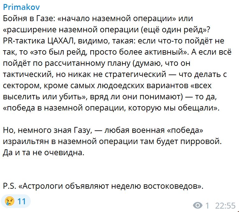 Однако ничем хорошим это не обернётся, уверен глава Россотрудничества Евгений Примаков. Любая военная "победа" израильтян в наземной операции в секторе Газа будет пирровой, указал он в своём телеграм-канале.