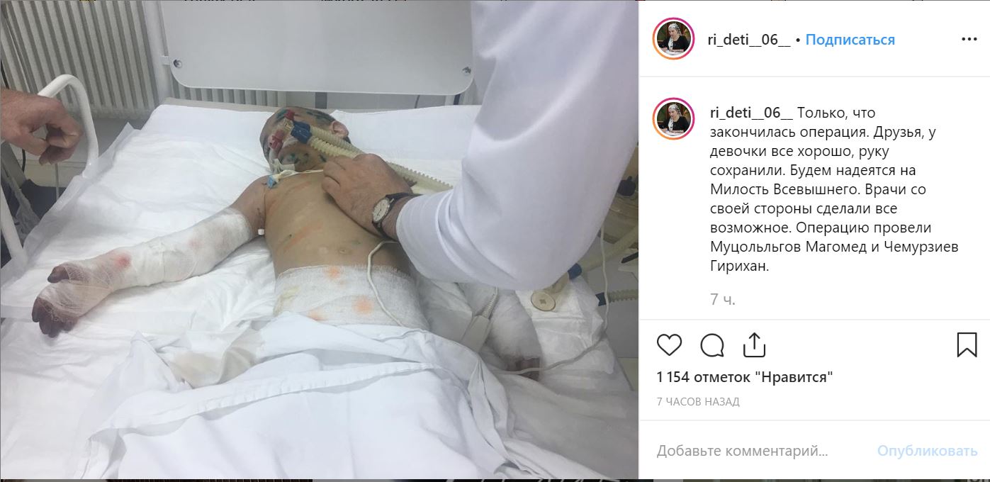 Врачам едва удалось сохранить девочке руку. Её прооперировали, удалив серьёзный тромб, это позволило восстановить кровообращение. Сейчас малышка остаётся в реанимации, затем её переправят к доктору Леониду Рошалю.