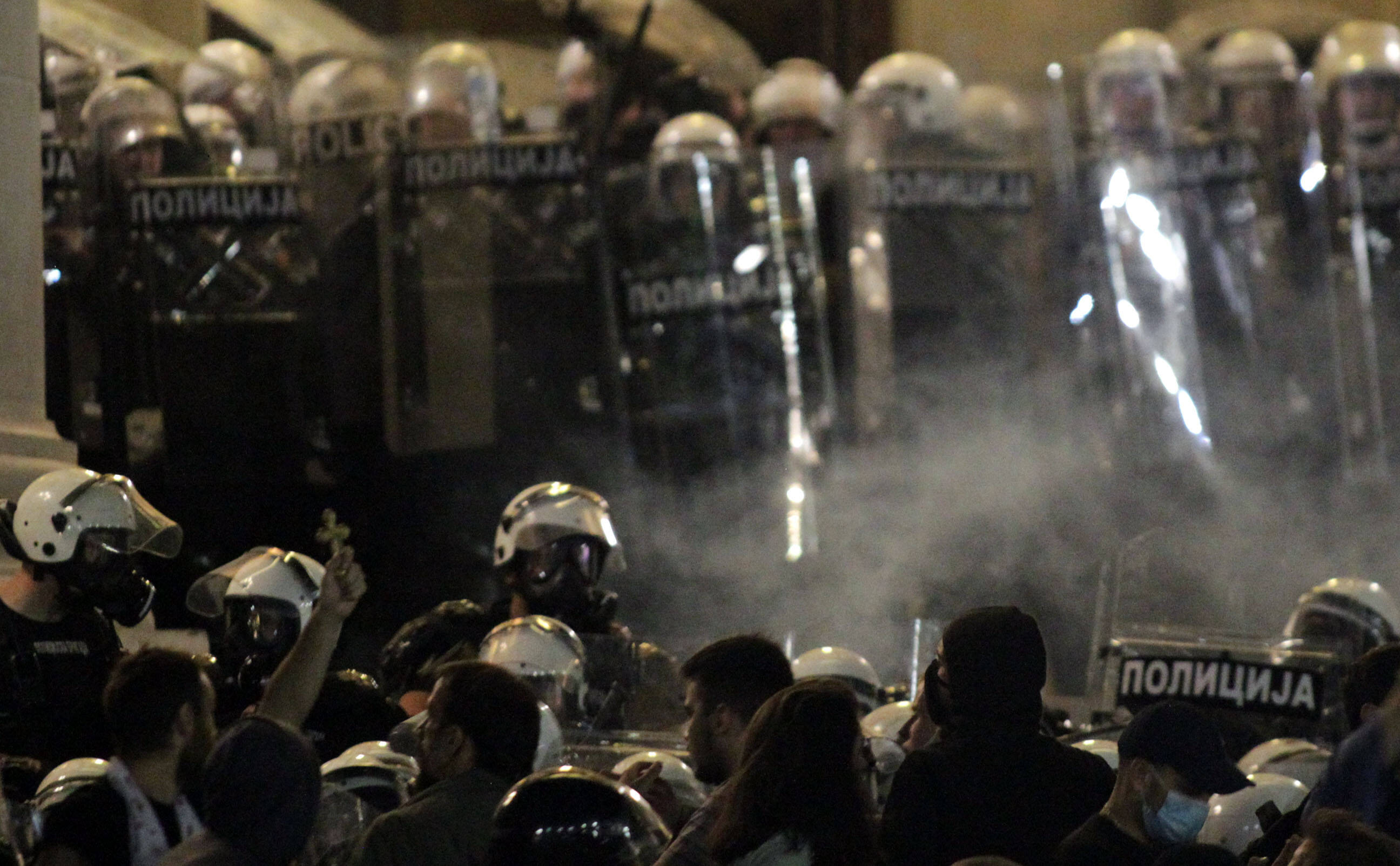 Вход в здание щитами заблокировала прибывшая на место сербская полиция. При нескольких попытках прорыва линии, правоохранители применили против митингующих слезоточивый газ. Позже, по сообщению ряда СМИ, в толпе сработала дымовая шашка, тогда демонстранты сначала удалились от здания, а затем вновь продолжили забрасывать администрацию. В итоге полиция оттеснила протестующих от здания, очистила от толпы и площадь – там выставили оцепление.