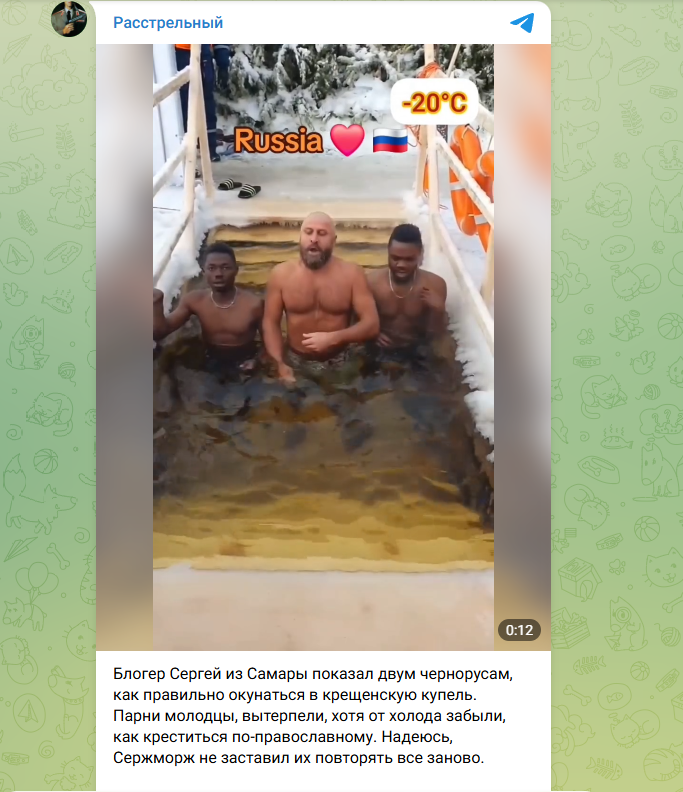В Рунете разошлось видео, как два африканца под чутким руководством блогера из Самары окунаются в купель. Ролик снять на Крещение: иностранцы очень хотели приобщиться к удивительной для них традиции погружаться в ледяную воду.