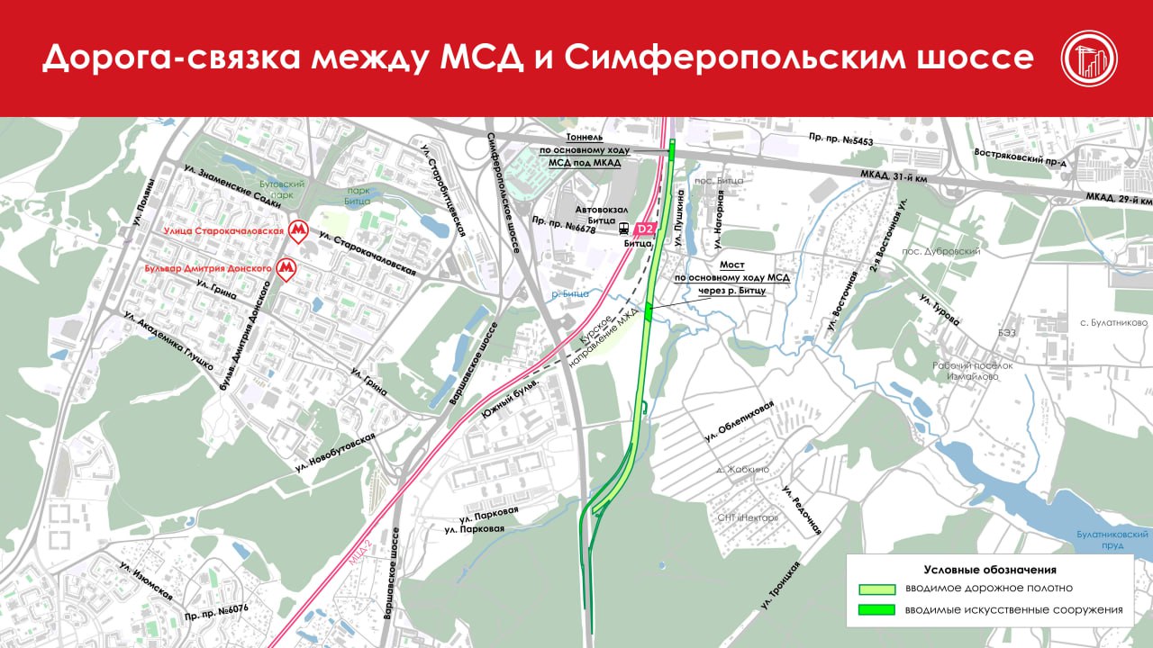 Также в Москве завершилось строительство дорожной связки между Московским скоростным диаметром (МСД) и Симферопольским шоссе. Новая связка позволит ликвидировать перепробеги до 2,5 километра и сократить время проезда в среднем на 23 минуты, сообщает mos.ru.