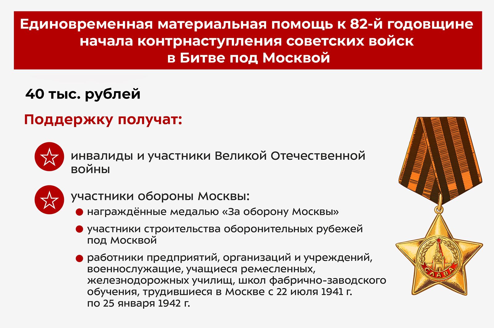 В числе получающий выплаты - награждённые медалью "За оборону Москвы", участники строительства оборонительных рубежей под Москвой, работники предприятий, организаций и учреждений, военнослужащие, учащиеся ремесленных, железнодорожных училищ, школ фабрично-заводского обучения, работавшие в Москве с 22 июля 1941 года по 25 января 1942-го.