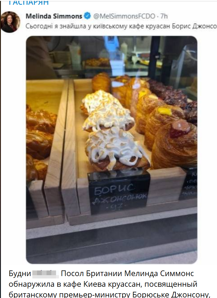 Британский посол Мелинда Симмонс на своей странице в соцсети поместила фото, сделанное в одном из киевских заведений общепита. На витрине был выставлен круассан, названный в честь британского премьера Бориса Джонсона.
