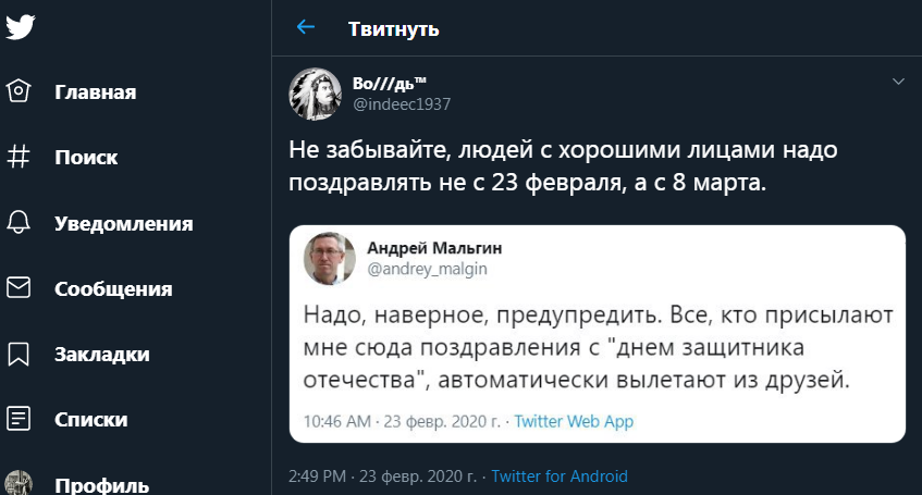 "Не забывайте, людей с хорошими лицами надо поздравлять не с 23 февраля, а с 8 марта", - с сарказмом прокомментировал это сообщение автор микроблога в Twitter "Во///дь".