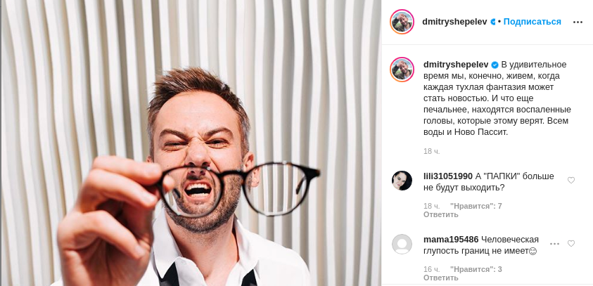 В Сети сообщили, что якобы "Шепелева уволили с Первого канала". Вдовец Жанны Фриске ответил на этот информационный вброс заявлением в Instagram, где назвал подобные новости "тухлой фантазией".