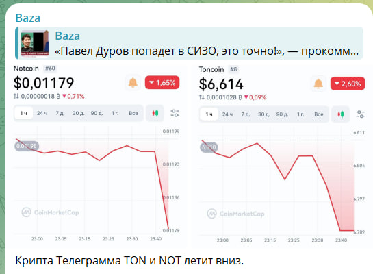 Также, согласно информации издания Baza, криптовалюта, созданная на платформе Telegram, TON и монета на её основе NOTcoin стремительно летят вниз сразу после появления первых новостей об аресте Дурова.