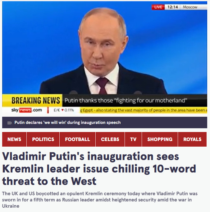 Британская The Mirror воспользовалась поводом, чтобы напугать своих читателей. Таблоид выпустил статью с заголовком: "Во время инаугурации Владимир Путин выступил с леденящей душу угрозой Западу из десяти слов".