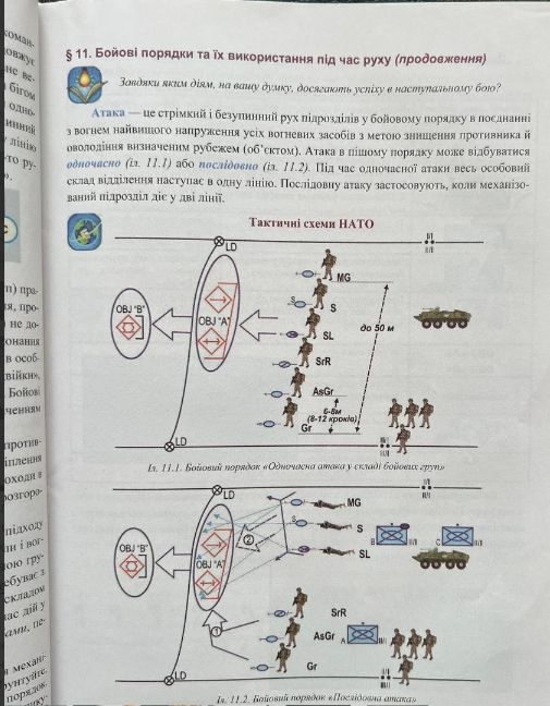 Есть один весьма любопытный нюанс: в обнаруженных нашими военными "учебниках" в Волновахе украинских школьников фактически учат боевым порядкам и тактическим схемам НАТО и даже рассказывают, как оказывать помощь при пулевых ранениях.