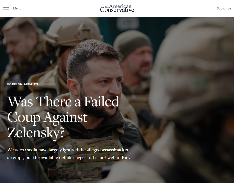 Западные СМИ проигнорировали предполагаемое покушение на Зеленского, но даже имеющиеся подробности позволяют заключить, что в Киеве не всё ладно, пишет The American Conservative. Автор статьи не очень верит в "русский заговор" и считает произошедшее позорным внутренним переворотом.