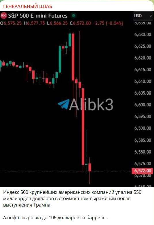 Первые 25 минут. Рынок обвалился на полтриллиона долларов. Цена на нефть вновь подскочила. Скриншот с канала "Генеральный Штаб"