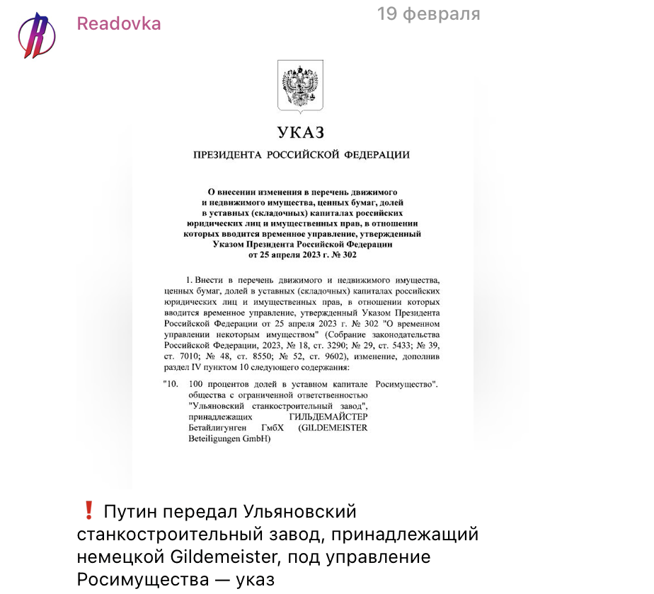 Очевидно, что переход немецкого завода под контроль Росимущества стал знаком для недоброжелателей с Запада, выступающих за отъём активов России в пользу "страны 404". Путин показал, что русские не будут терпеть незаконное изъятие своих активов за границей. Более того, по данным некоторых источников, президент подписал указ №133 по изменению в управлении Ульяновским станкостроительным заводом.