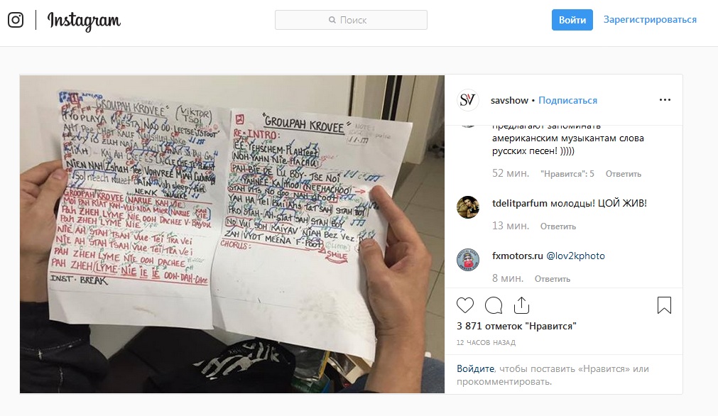 Фото шпаргалки прокомментировал сын Виктора Цоя. По его словам, американские исполнители напоминают пэтэушников. В 90-х годах именно так они записывали английские песни, а потом коряво их исполняли. Теперь же ситуация прямо обратная.