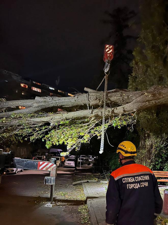 В Сочи наступила ночь громких пил. На видео видно, как местные жители распиливают стволы рухнувших на дороги деревьев.