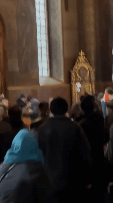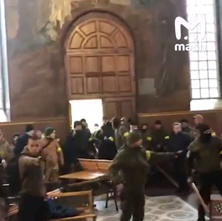 Очевидцы говорят, что на радикалах была военная форма. В глаза бросались жёлтые повязки. Этим персонажам удалось добраться до алтаря. Затем они попытались выгнать людей из храма, но верующие дали бой.