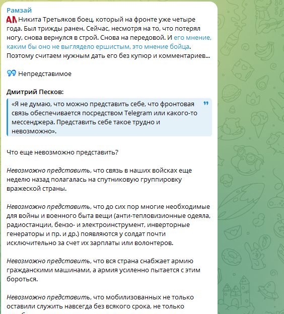 Третьяков в своём ответе Пескову перечислил то, чего он, защищающий свою страну мужчина, представить не может. В первую очередь он напомнил: ещё неделю назад связь в русской армии была организована с опорой на спутниковую группировку вражеской страны.