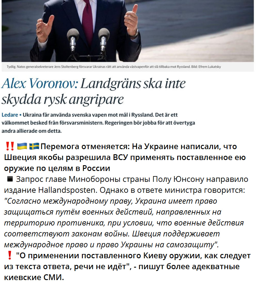 Швеция разрешила Киеву применять поставленное Стокгольмом оружие для нанесения ударов по целям на территории России. Об этом говорится в письменном ответе министра обороны Пола Юнсона на вопрос газеты Hallandsposten. В своем ответе министр указал, что шведы придерживаются мнения, что Украина применяет право на самозащиту.