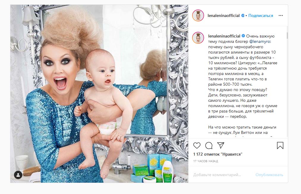 Эпатажная блогер и бизнесвумен из Новосибирска Лена Ленина подняла в своем микроблоге тему несправедливого назначения алиментов. Она процитировала пост своей коллеги, не менее известного блогера и тезки Лены Миро.