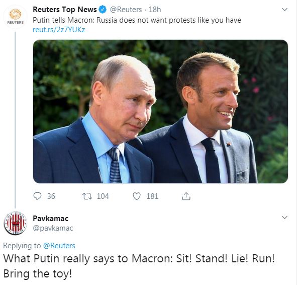 "Что Путин на самом деле говорит Макрону: Сидеть! Стоять! Лежать! Бежать! Принести игрушку!" – шутит пользователь Pavkamac.