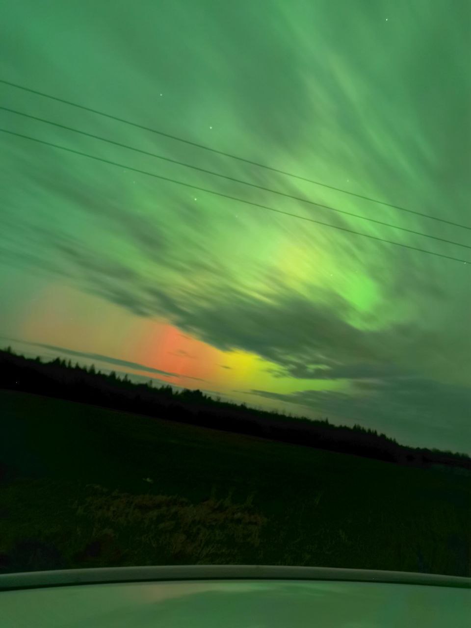 Зелёный, жёлтый и оранжевый цвета переливаются в небе на границе Ивановской и Нижегородской областей.