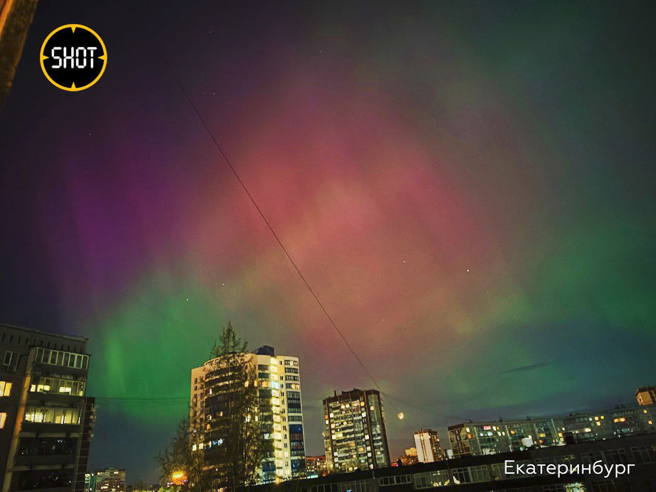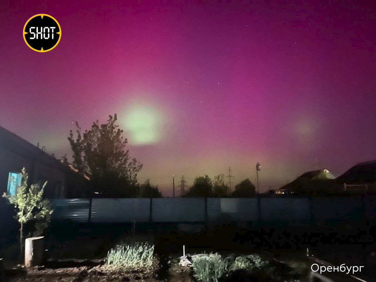 В Оренбурге на розовом от сияния небе появились жёлто-зелёные вставки.