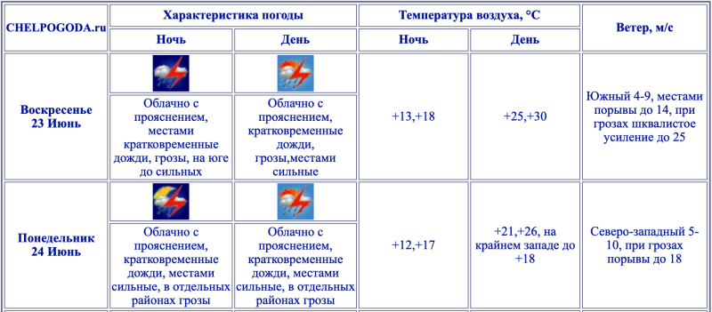— Днём 23 июня в отдельных районах Челябинской области ожидаются грозы, сильные ливни, очень сильные дожди, град, местами крупный. Шквалистое усиление ветра при грозах 20-25 м/с.