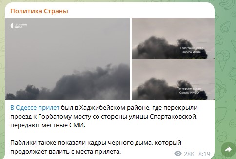 В Одессе прилёт был в Хаджибейском районе, где перекрыли проезд к Горбатому мосту со стороны улицы Спартаковской, передают местные СМИ. Паблики также показали кадры чёрного дыма, который продолжает валить с места прилёта,