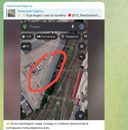 По данным крупнейшего одесского канала "Типичная Одесса", на месте удара поднимается плотный чёрный дым и разгорается пожар. Авторы также указали примерное место удара.