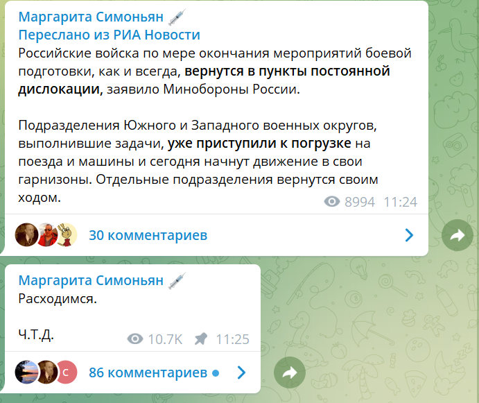Новость порадовала главреда RT Маргариту Симоньян, которая тремя буквами и одним словом успокоила всех, кто жаждал "войны" России и Украины и обвинял русских в стягивании войск к границам Незалежной.