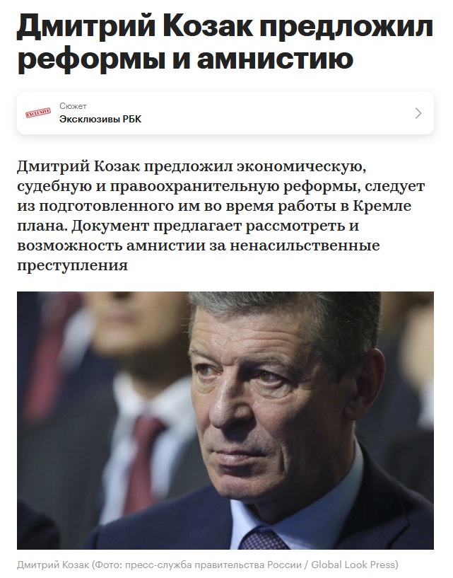 NYT утверждает, что Дмитрий Козак перед уходом из Кремля готовил для президента России Владимира Путина проекты реформ по улучшению инвестиционного климата. В частности, Козак якобы предлагал "значительно обновлённую и привлекательную демократическую модель развития России, в том числе за счёт исключения ошибок западных демократий" с внедрением модернизированных механизмов и институтов функционирования государства и общества.