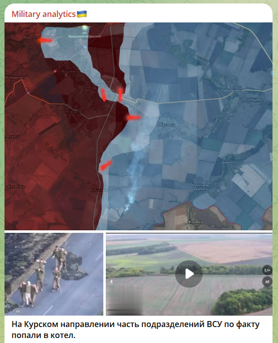 Источники сообщают, что ударный темп контратаки в Курской области связан с беспрецедентным количеством тяжёлой военной техникой и авиацией. Такой большой военный кулак очевидно был сделан не только для возвращения позиций в Курской области, атака остановится только на подступах к Сумам.