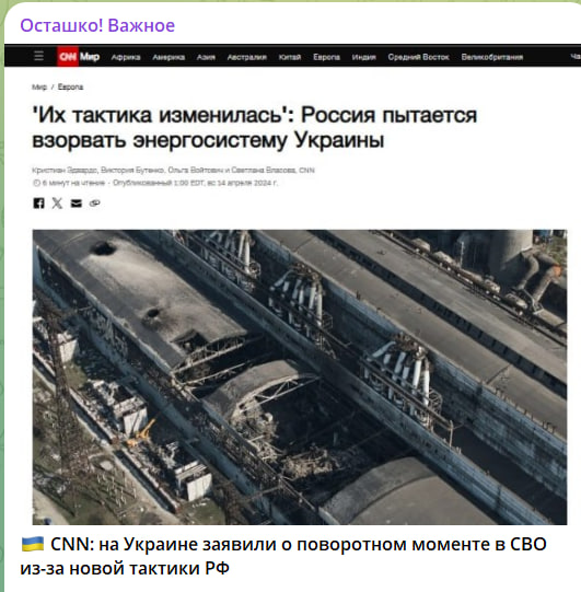 Уже в середине апреля была "полностью уничтожена" самая мощная действующая электростанция в Киевской области, Трипольская ТЭС. Крупнейшая украинская частная энергокомпания ДТЭК сообщила, что ударами уничтожено около 80% принадлежащих ей электрогенерирующих объектов. Как сообщали прозападные СМИ, русские применили ракеты X-69, вместо привычных "Кинжалов". Новые ракеты оказались быстрее, точнее и мощнее.
