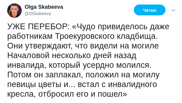СМИ со ссылкой на сотрудников Троекуровского кладбища, где покоится Юлия Началова, сообщили об "исцелении" инвалида на могиле певицы. Телеведущая Ольга Скабеева, узнав об этом, эмоций в Сети не сдержала и перешла на "крик" - caps lock написала: "Уже перебор".