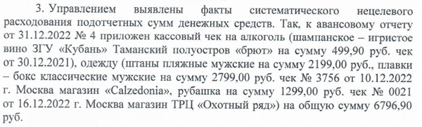 Расходы осуществлялись на шампанское, тигровые креветки, обеды в кафе и ресторанах, проживание в дорогих гостиницах. Закуплены даже бутыли для производства вина в количестве 90 штук.