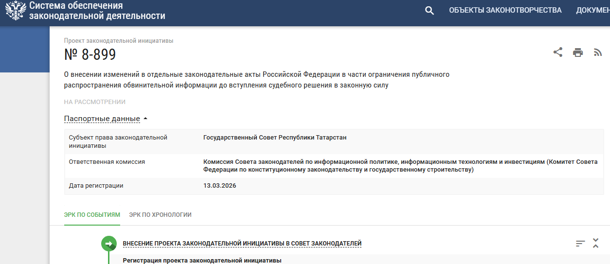 Некоторые средства массовой информации несколько вольно интерпретировали новость о том, что этот законопроект якобы внесён в Госдуму, это не так, процедурно он не внесён, а вынесен на рассмотрение в профильной комиссии Совета Законодателей. Это другой орган, он консультативный,